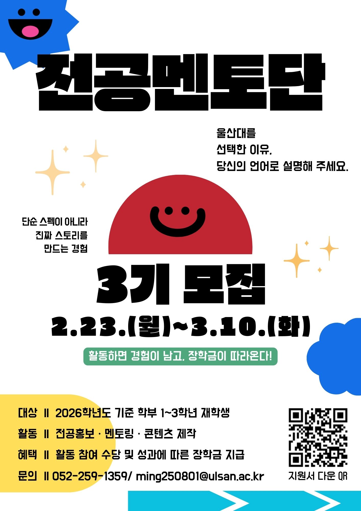 2027학년도 신입학 예정 수험생을 대상으로 울산대학교의 홍보 효과를 높이고, 고교생에게 울산대학교의 매력도를 높일 각종 홍보 콘텐츠 제작을 위해 전공멘토단을 운영하고자 합니다. 1. 운영 계획 1) 대상: 각 전공에서 추천한 우수 재학생 (1~3학년 중 선발) ※ 지원 마감 후 학과에서 선발 예정 2) 내용: 교내·외 프로그램 중 전공 홍보, SNS 홍보 등 3) 활동기간: 2026. 3. ~ 2027. 2. (12개월) 4) 활동영역: 고교생 대상 전공 안내 및 진로멘토링, 대학생활 콘텐츠 제작 등