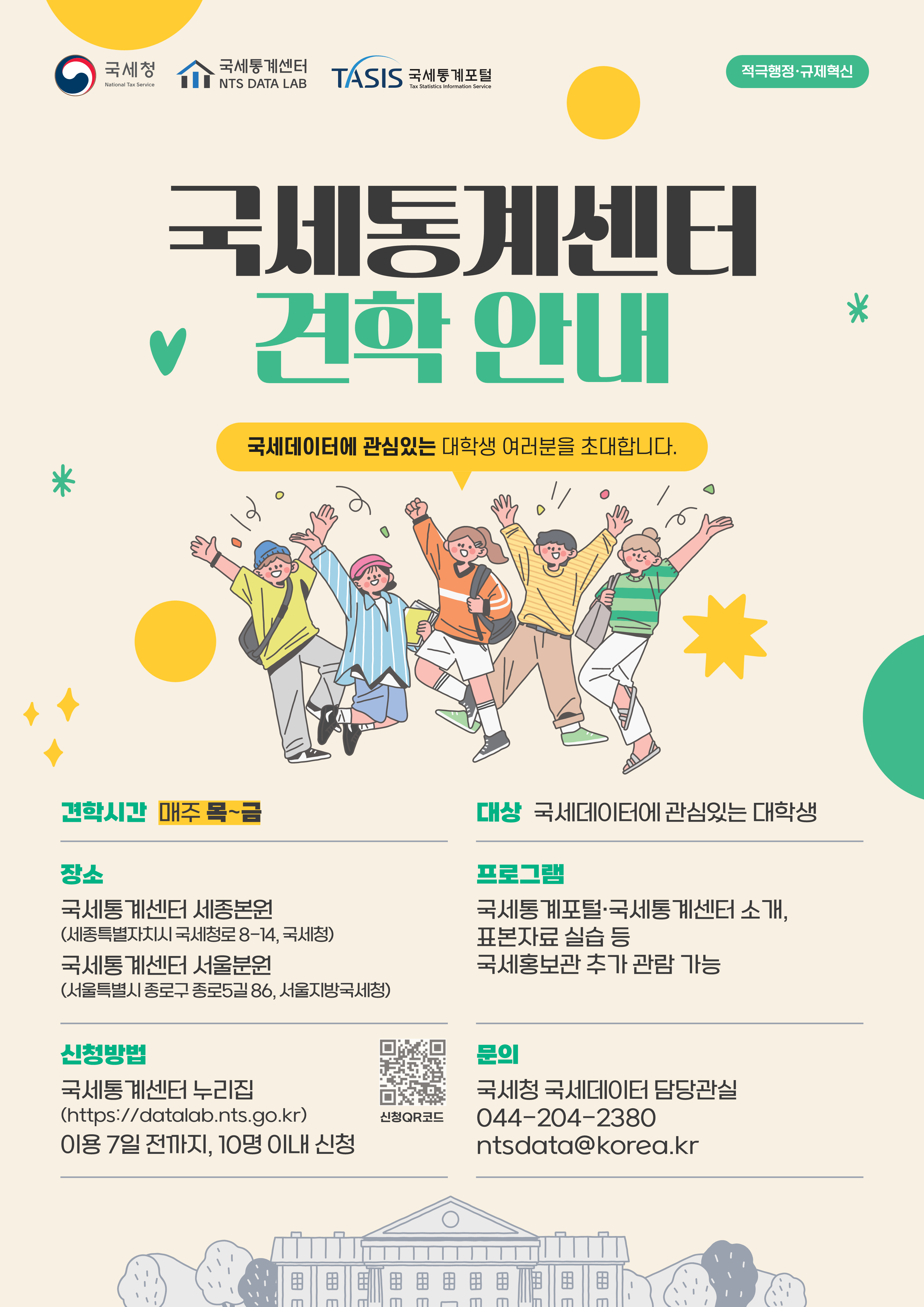○ 신청대상 : 조세·재정·데이터 분석 등 국세데이터 관련 학과*대학생 * 경영, 경제, 행정, 세무, 회계, 데이터, 통계 등 ○ 일시 : 매주 목 · 금(오전, 오후) ○ 장소 : 국세통계센터 세종본원 및 서울분원 ○ 신청방법 : 국세통계센터 누리집(https://datalab.nts.go.kr) ○ 문의처 : 044-204-2380, ntsdata@korea.kr ○ 견학순서 : 국세데이터 소개(10분) → 표본자료 실습(R 또는 엑셀중심)(30분) → 조세박물관(세종본원) 또는 국세홍보관(서울분원) 관람(20분)