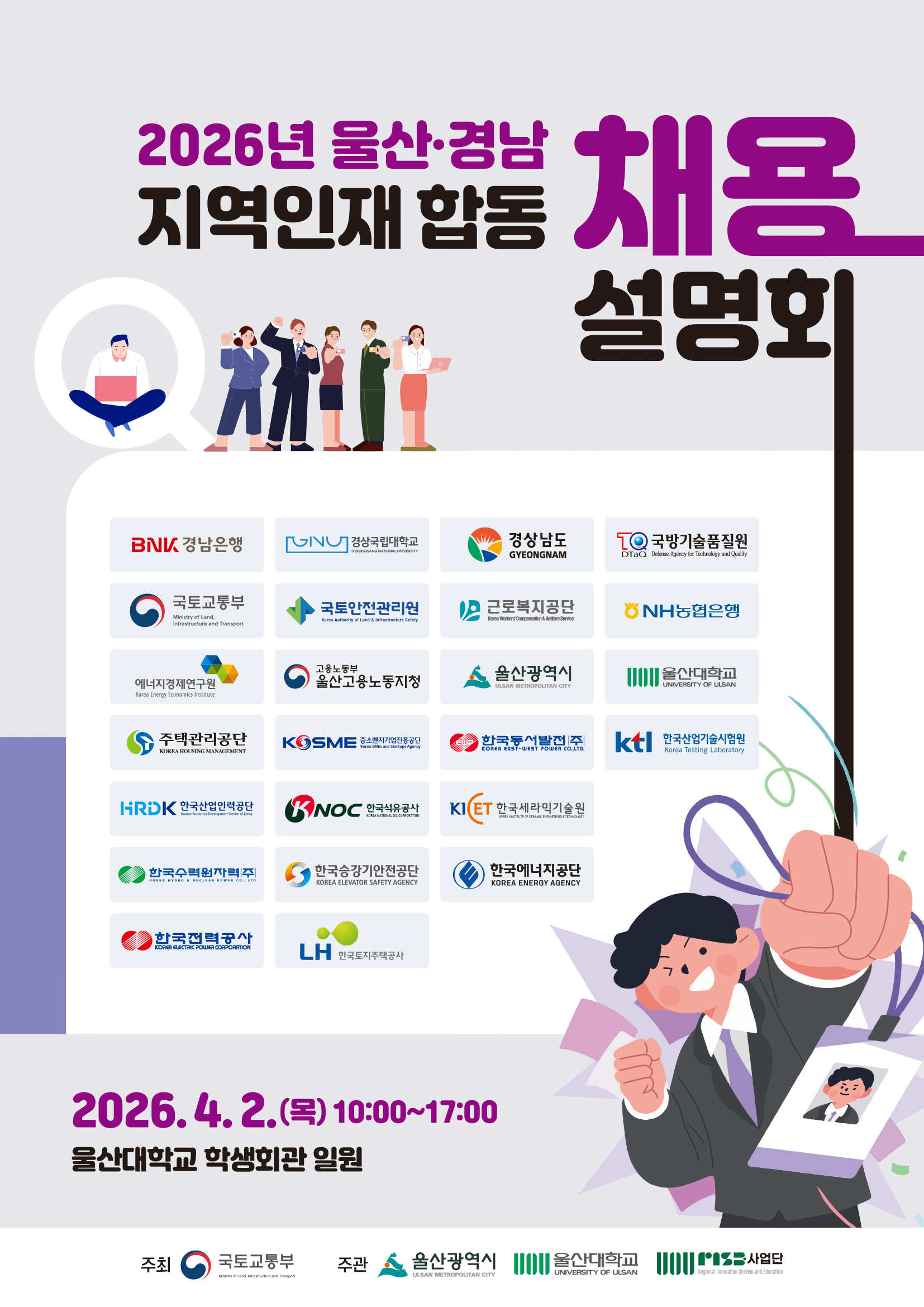 2026년 울산 경남 공공기관 지역인재 합동채용설명회 안내 가. 행사명: 2026년 울산 경남 공공기관 지역인재 합동채용설명회 나. 일시 및 장소: 2026. 4. 2.(목) 10:00~17:00 / 학생회관 일원 - 채용설명회: 10:30 ~ 16:00 / 학생회관 지하 대형강의실 - 채용상담 부스: 10:00 ~ 17:00 / 학생회관 광장 및 무거갤러리(지하) 다. 참여기관: 울산 경남 이전공공기관 등 27개 기관