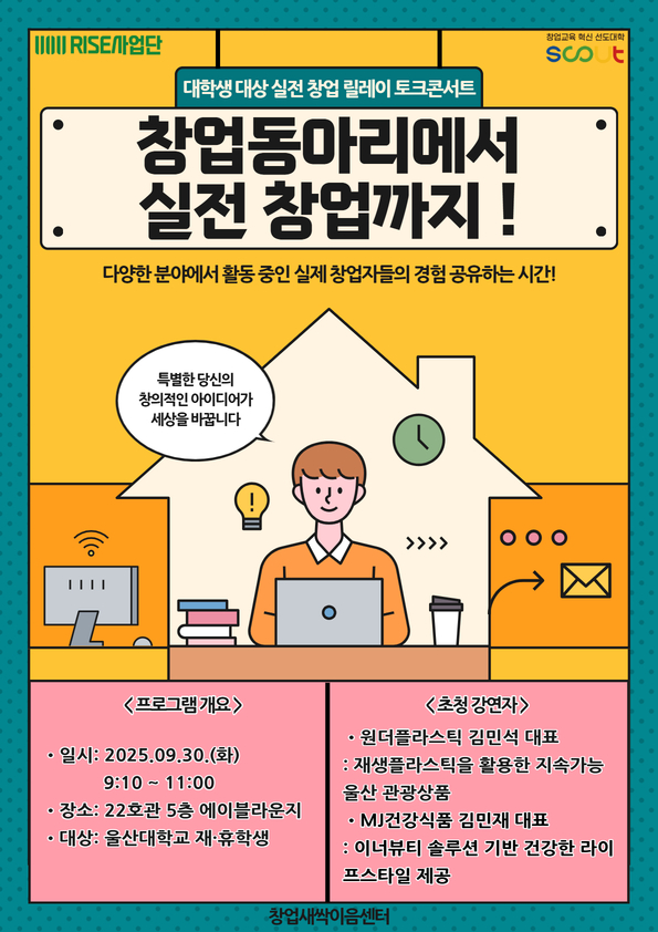 [RISE사업단 창업새싹이음센터] 대학생 대상 질전 창업 릴레이토크쇼 : 창업동아리에서 실전 창업까지! 1. 프로그램명: 대학생 대상 실전 창업 릴레이토크쇼: 창업동아리에서 실전 창업까지! 2. 일시: 2025.09.30.(화) 9:10 ~ 11:00 3. 내용 - 창업동아리 학생 중 실제 창업까지 이어진 학생들의 경험을 공유하고, 동아리 활동에서 창업으로의 전환 과정을 공유 - 2명의 강연자가 릴레이 강연 진행 - 초청 강연자 이력 1) 원더플라스틱 김민석 대표: 재생플라스틱을 활용한 지속가능 울산 관관상품 2) MJ건강식품 김민재 대표: 이너뷰티 솔루션 기반 건강한 라이프스타일 제공 4. 신청 방법 - 울산대학교 U-STAR 접속하여 신청! - 신청기간: ~ 9/29(월) 15:30까지!! - 신청링크: 전체 - 울산대학교 비교과통합관리시스템(https://ustar.ulsan.ac.kr/ko/program/ALL/view/2850) 5. 문의: 창업새싹이음센터 조주원 연구원 (052-259-1055)