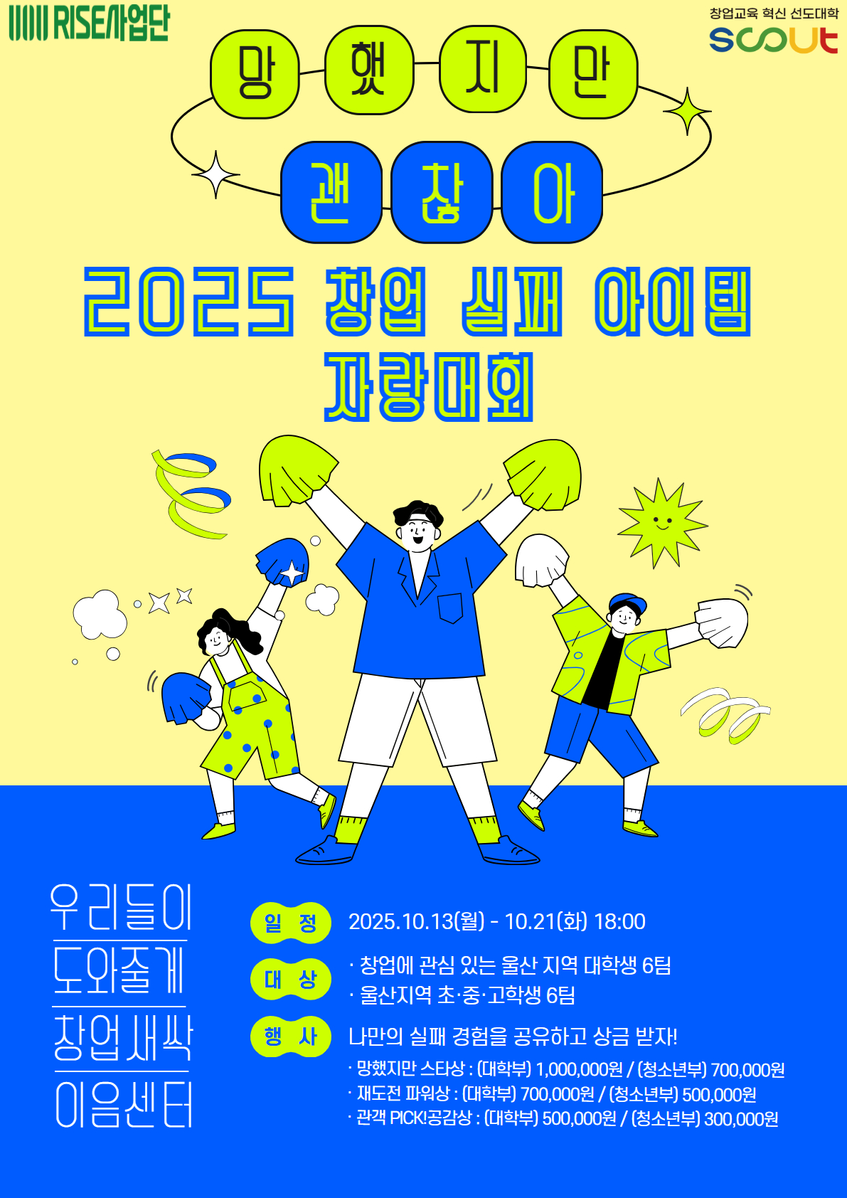 [RISE사업단 창업새싹이음센터] '2025 창업 실패 아이템 자랑대회' 프로그램 안내 1. 프로그램명: 2025 창업 실패 아이템 자랑대회 ⌈망했지만 괜찮아!⌋ 2. 프로그램 개요 - 나만의 창업 실패 경험을 공유하며, 실패를 통해 얻은 교훈 및 극복 전략 사례 발표 - 실패 아이템 전시 및 체험 • 참가팀이 제출한 실패 아이디어 전시 • 관람객이 전시물을 직접 체험하고, 공감·흥미도에 따라 투표 참여 - 프로그램 일정 등 관련 자세한 사항은 첨부파일을 확인해주시기 바랍니다. 3. 모집 및 신청방법 - 모집기간: ~ 2025. 10. 21.(화) - 신청대상: 창업에 관심 있는 울산 지역 대학생 6팀 - 제출서류: 지원신청서 1부 (첨부파일 공고문 확인) - 신청방법: 이메일을 통한 신청서류 제출(cherry0752@ulsan.ac.kr)