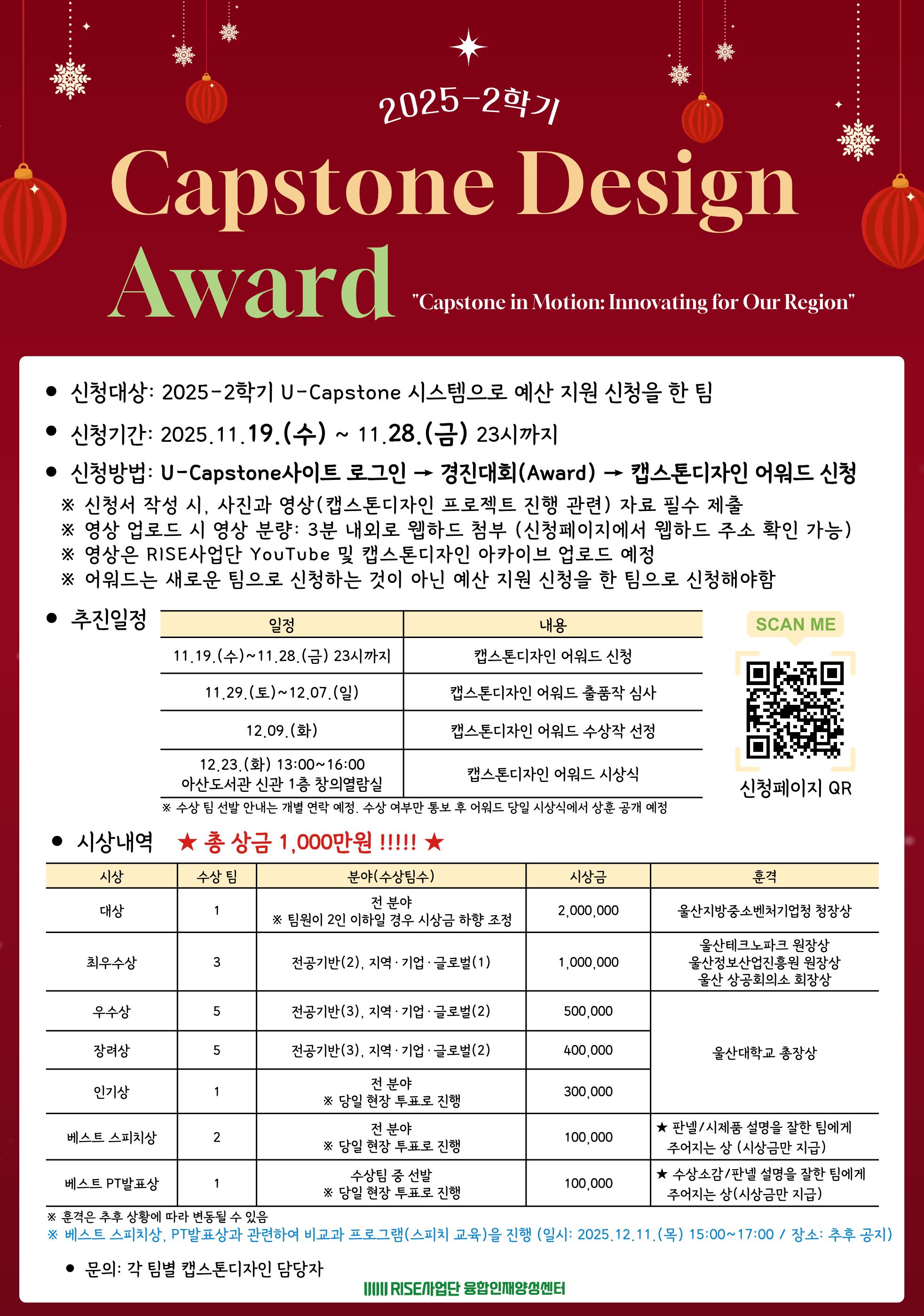 2025학년도 2학기 캡스톤디자인 어워드 안내 ● 프로그램 개요 - 목적: 캡스톤디자인 어워드 참가를 통해 학생들의 창의적 사고, 문제해결능력, 발표 역량 향상 및 성과를 선정, 전시, 공유함으로써 학생들의 성취감과 자긍심 고취 - 대상: 2025학년도 2학기 U-Capstone 시스템으로 예산 지원 신청을 한 팀 - 신청기간: 2025. 11. 19.(수) ~ 11. 28.(금) 23시까지 - 신청방법: U-Capstone사이트 로그인 > 경진대회(Award) > 캡스톤디자인 어워드 신청